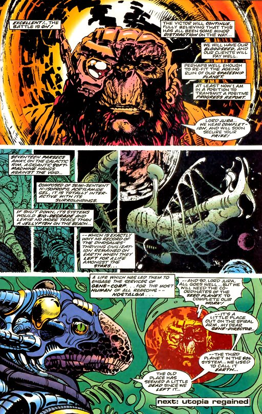 Lysander and Elyssa's progress in these trials eventually alerts the attention of Gene-Corp's Chief Engineer, who having convinced Lysander to remove his helmet (unfortunately triggering Elyssa's programming, and setting her trying to kill him) then contacted his client. And that's kind of the twist in this tale. Their client goes by the name of Lord Juno. And he comes from Earth.
